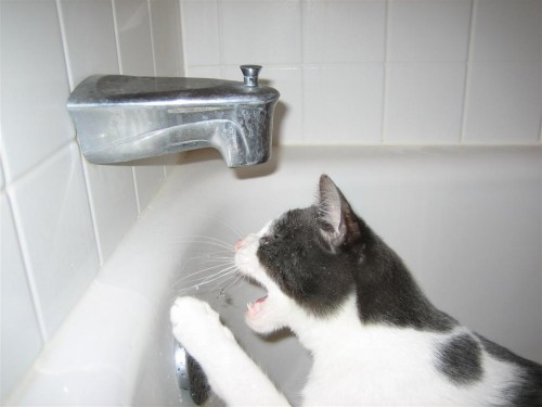I've mentioned before about how our cats like the bathtub. But I discovered a new thing: Dilbert likes to drink water out of the tap like a dog. He bites at each drop that falls. What a strange little animal.