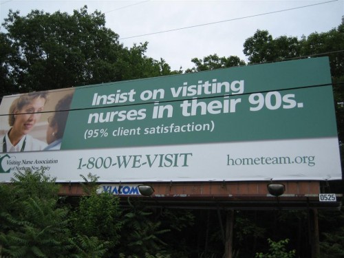 There's a sign on Route 10 in Ledgewood (actually there's one on each side of the road) near Towne Toyota and Cliff's Dairy Maid that says something so cryptic and misleading, I (and Wendy) can't for the life of me figure out what it means. The picture below states, "Insist on visiting nurses in their 90s." It shows a picture of a woman in her 30s-40s with a green band around her neck (signifying that she's a visiting nurse) visiting an elderly woman (supposedly in her 90s). Does it mean I should "insist on visiting nurses [who are] in their 90s"? Or does it mean that "[People who are in their 90s should] insist on visiting nurses"? Whatever it means, the people in the organization sure spent a lot of money advertising a message that doesn't make sense. I'm so confused by this sign, I sent an email to the organization. I'll post the reply if I get one.