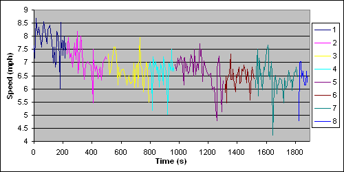 I'm a nerd, so I went running today with an iPod and a GPS device, and I extracted and correlated the data from each device to show which song was playing at different points along my run and how fast I was running at each of those points, and I put that data into Excel and plotted it: