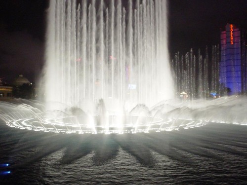 This article from the IEEE geek magazine talks about a guy who designs the fountains for the Bellagio in Las Vegas. His initial task was to double the height of the spray to 160 feet, which causes problems with the FAA because they say it shows up on their radar. How awesome is that? (via Boing Boing). Here's my picture from January, 2005.